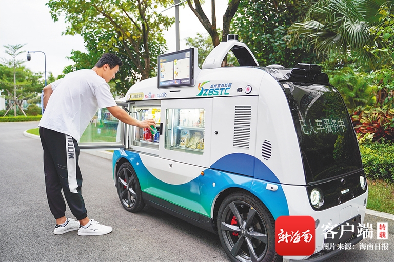 图为居民在使用无人驾驶零售车扫码购买饮品。海南日报记者武威 摄