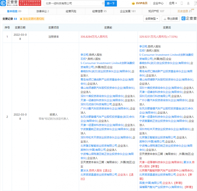 【TechWeb】企查查APP显示,3月8日,北京一径科技有限公司发生工商变更,新增百度(中国)有限公司等为股东,同时公司注册资本由306.83万元人民币增加至329.92万元人民币,增幅为7.53%。企查查信息显示,一径科技是一家无人驾驶汽车雷达研发商,公司成立于2017年,法定代表人为石拓,经营范围包含:智能光机电芯片与系统的技术开发、技术服务、技术咨询、技术推广、技术转让等。
