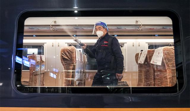 工作人员正在给京张高铁车厢清洁消毒。视觉中国图