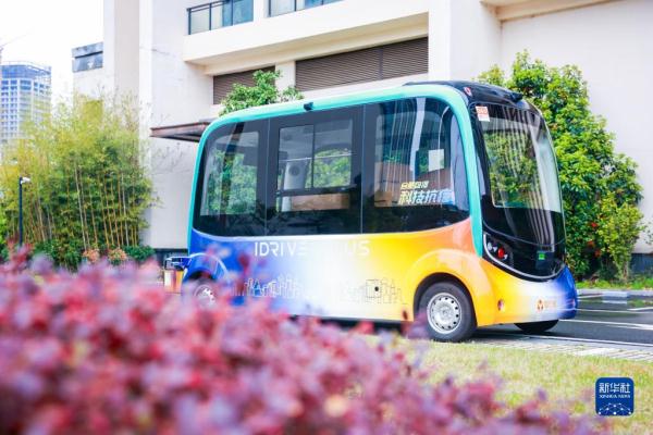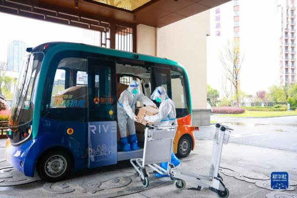 3月22日,无人驾驶巴士在合肥一家隔离酒店进行物资配送。新华社发