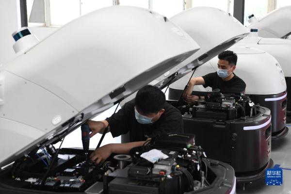 4月27日,合肥智行者科技有限公司工作人员在进行无人驾驶洗地车的组装。新华社记者 张端 摄