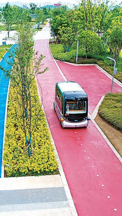 图为在蓉江新区滨江公园,一辆模拟接送游客的无人驾驶智能汽车在运行。