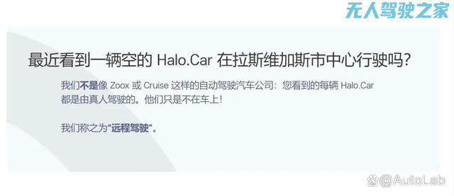 2021年,Halo.Car在拉斯维加斯推出的无人驾驶汽车服务的车也是无人驾驶,因为这车确实没有驾驶员,但其实这车是由技术人员远程控制的。