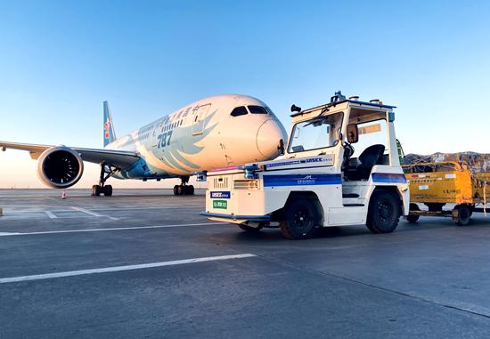 无人驾驶行李牵引车正在工作。(受访者供图)