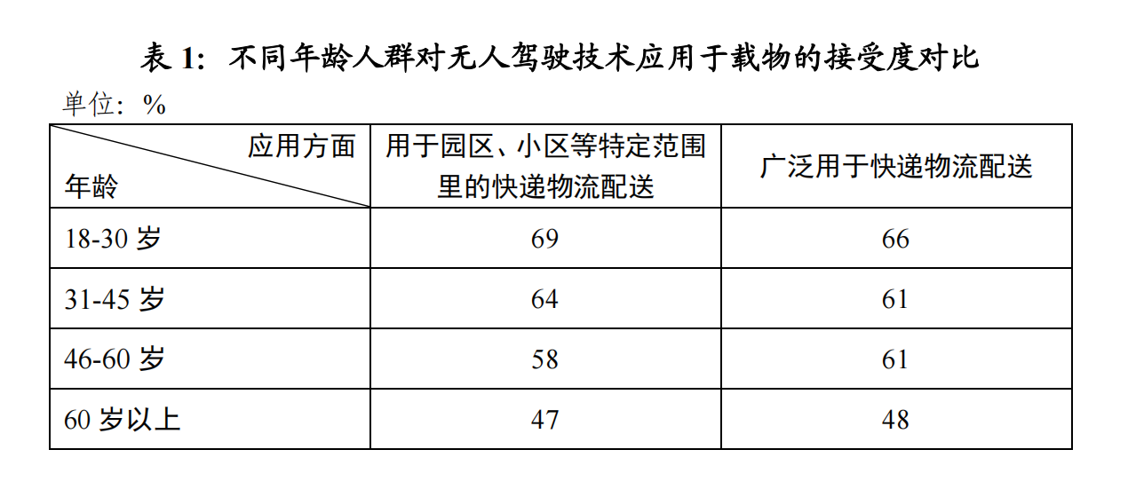 进一步分析发现,接受无人驾驶应用于载物的人群中,18-30岁年轻一代的比例更高,分别为69%和66%,与60岁以上的老龄群体相比高出了22和18个百分点。