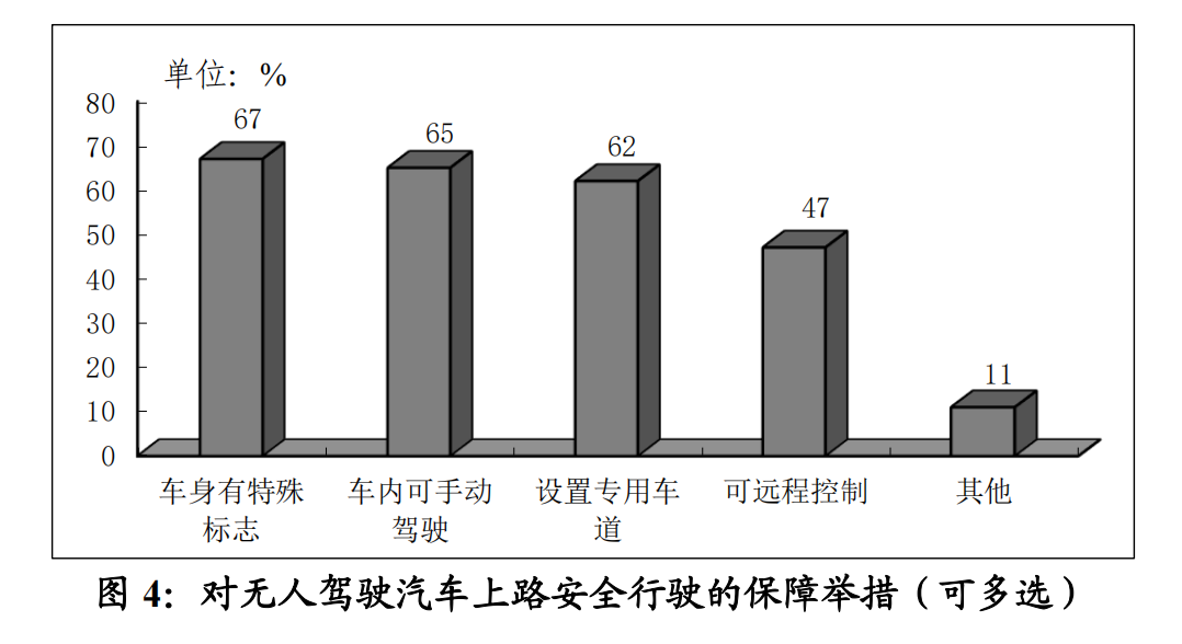 除了立法监管之外,受访市民认为提高驾驶安全保障和加强交通秩序管理方面等措施很有必要。具体表现为:超过六成的受访市民认为无人驾驶汽车“车身需有特殊标志”“车内可手动驾驶”和“设置专用车道”这几项措施都是必要的,比例分别是67%,65%和 62%;另外选择“可远程控制”这一项的比例也接近50%。
