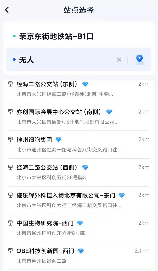 经过我们调查小组的多次测试,萝卜快跑目前拥有一个彩蛋,就是在其 APP 搜索无人两个字之后就会出现有钻石的站点,此时叫车会比平常叫到无人车的几率要高,而智驾君在当天多次测试钻石站点打到无人车的概率是 50% 以上。