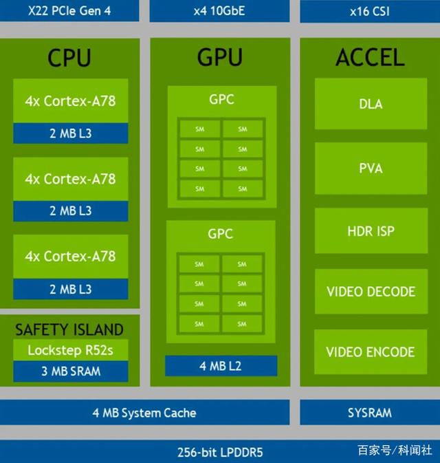 随着汽车电子架构的演进,新出现了网关SoC,典型代表NXP的S32G274A。通常网关SoC不需要太强算力,不过S32G274A有4个Cortex-A53内核,达到低端座舱的水准。还有英伟达的Orin,是一个典型的智能驾驶SoC,包含存储管理、外围、CPU、GPU和加速器。CPU、GPU、AI加速器以及连接子系统的总线或片上网络(NoC)是SoC的核心。