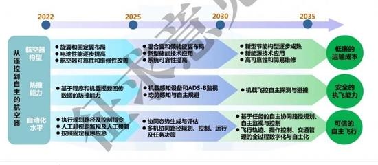 在 2035 年之前,建立载人无人驾驶航空交通运输系统,实现广域的运输范围和灵活高效的网络化布局。实现数字化的飞行活动保障,提供全面的航行服务,按照隔离、过渡、融合三步实现无人驾驶航空融入国家空域体系。城市中长距离快速中大型物流配送无人驾驶航空器逐步推广;支线长途高空吨级大型无人驾驶航空器实现航线飞行;中长距离载人无人驾驶航空器探索应用。具备换乘能力的枢纽型大型无人驾驶航空器起降场投入使用。起降点、起降场和集成化起降枢纽三级网络逐步形成。自主智能化复杂任务完成能力,自适应、自诊断、自决策、重规划能力逐步具备,逐步脱离人机交互,实现自主监视与控制;实现飞行轨迹、操作控制、交通管理的全过程数字化与自动化能力。