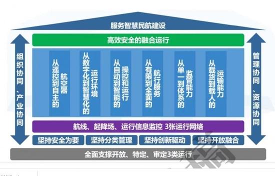 民用无人驾驶航空发展进程,以高效安全的融合运行为目标,拓展从遥控到自主的航空器等 6 个发展领域