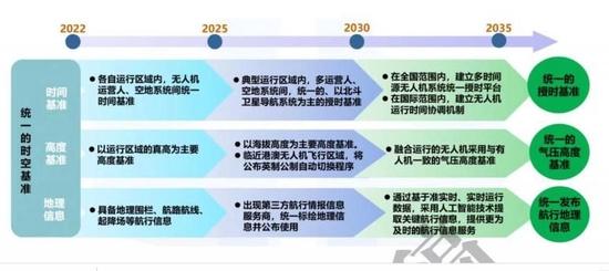 从发展目标看,发展路线图提出在 2025 年之前,实现统一的时空基准,提升航空器安全自主飞行能力和航行保障能力,降低运输成本。城市短距离低速轻小型物流配送无人驾驶航空器逐步成熟;支线短途中低空吨级大型无人驾驶航空器逐步应用;以及配备基本天气观测和着陆引导设备的,非载人起降场(起降点)广泛出现。采用独立运行方式,具备手动或自动装卸快递能力。试验性载人无人驾驶航空器起降场逐步出现。全面具备基于程序和机载视频回传数据的防撞能力、基于无人驾驶航空服务提供方(USS)的路径规划与指令执行能力,支持人工超视距监视及人工接管功能,提升基于程序的应急处置能力。